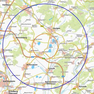 Eine sogenannte Schutzzone umfasst ein Gebiet mit drei Kilometern Radius um den Ausbruchsort. Eine sogenannte Überwachungszone erstreckt sich noch weiter: Sie betrifft alle Vogelhaltungen innerhalb von zehn Kilometern rund um den Ausbruchsort. In diese Überwachungszone fallen Teile der Städte Hungen, Laubach, Lich und Pohlheim. Ebenso liegen Teile des benachbarten Wetteraukreises darin. Der Wetteraukreis erlässt aus diesem Grund ebenfalls eine Allgemeinverfügung.
