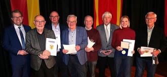 Bürgermeister Marius Reusch (r.) verlieh die Ehrenamtspreise 2025 an (v. l.): Reinhard Puhl, Friedhelm Straßheim und Diedrich Steffens.