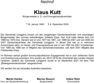 Die Gemeinde Langgöns trauert um den langjährigen Gemeindevertreter und ehemaligen Bürgermeister des vormals selbständigen Ortsteils Espa. Herr Kutt hatte dieses Amt von 1968 bis 1976 inne. Danach war er vom 1977 bis 1981, von 1989 bis 2001 und von 2006 bis 2021 Gemeindevertreter der Gemeinde Langgöns. In dieser Zeit war er in mehreren Ausschüssen aktiv, im Haupt- und Finanzausschuss war er von 1997 bis 2001 Vorsitzender.
