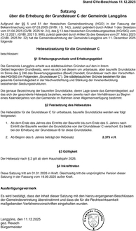 Aufgrund der §§ 5 und 51 der Hessischen Gemeindeordnung (HGO) in der Fassung der Bekanntmachung vom 07.03.2005 (GVBl. I S. 142), zuletzt geändert durch Artikel 1 des Gesetzes vom 01.04.2025 (GVBl. 2025 Nr. 24), des § 13 des Hessischen Grundsteuergesetzes (HGrStG) vom 24.12.2021. (GVBl. 2021 S. 906), zuletzt geändert durch Artikel 3b des Gesetzes vom 27. März 2025 (GVBl. 2025 Nr. 22) hat die Gemeindevertretung der Gemeinde Langgöns am 11. Dezember 2025 folgende