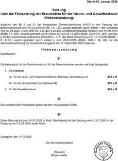 Aufgrund der §§ 5 und 51 der Hessischen Gemeindeordnung (HGO) in der Fassung der Bekanntmachung vom 07.03.2005 (GVBl. I S. 142), zuletzt geändert durch Artikel 1 des Gesetzes vom 01.04.2025 (GVBl 2025 Nr. 24), des § 25 des Grundsteuergesetzes (GrStG) vom 07.08.1973 (BGBl. I S. 965), zuletzt geändert durch Artikel 32 vom 02.12.2024 (BGBl. 2024 I Nr. 387) und des § 16 des Gewerbesteuergesetzes (GewStG) i. d. F. der Bekanntmachung vom 15.10.2002 (BGBl. I S. 4167), zuletzt geändert durch Artikel 4 vom 28.02.2025 (BGBl. 2025 I Nr. 69) hat die Gemeindevertretung der Gemeinde Langgöns am 11. Dezember 2025 folgende