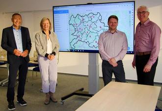 Landrätin Anita Schneider bedankte sich während der Vorstellung des neugestalteten BürgerGIS bei Timo Zumkley (2. v. r.), zuständig beim Landkreis Gießen für das raumordnerische Datenmanagement. Ebenfalls teilgenommen an der Veranstaltung haben Uwe Happel (r.), Stabsstellenleiter Kreisentwicklung und Strukturförderung, sowie Jörg Tieben (l.), Geschäftsführer der Softplan Informatik GmbH