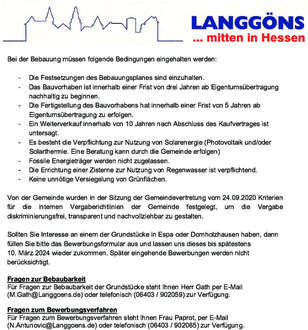 Für Fragen zur Bebaubarkeit der Grundstücke steht Ihnen Herr Gath per E-Mail (M.Gath@Langgoens.de) oder telefonisch (06403 / 902059) zur Verfügung.