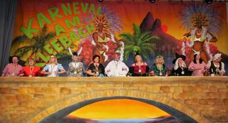 Bürgermeister Marius Reusch begrüßte die Besucher: „Ich freue mich, dass nach der langen Coronapause endlich wieder Fasching gefeiert werden kann.“ Er würdigte auch die Initiative des Carnevals Club Dornholzhausen (CCD), der während Corona sogar extra eine Online-Faschingssitzung zusammengestellt hatte. Nun gab es den „Karneval am Kleebach“ endlich wieder live und in Farbe, wobei der bunt kostümierte Elferrat, bei dem Sitzungspräsident Dr. Frank Schneider als einziger Mann der Hahn im Korb war, vor der südamerikanisch inspirierten Bühnenkulisse ein prächtiges Bild abgab.