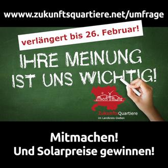 Die Umfrage, die aktuell in den ZukunftsQuartieren im Landkreis Gießen gestartet worden ist, soll die Ausgangssituation zu Fragen der energetischen Situation festhalten und die Wünsche und Bedürfnisse der Teilnehmenden aufnehmen. Unter www.zukunftsquartiere.net/umfrage und dem Motto “Tun Sie etwas für Ihren Ort und das Klima - Nehmen Sie an der Umfrage teil”, werden hierbei gezielt die Menschen aus den Quartieren, darunter auch LANGGÖNS angesprochen, am Ende werden attraktive Solarpreise unter den Teilnehmenden verlost.