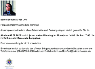 Erreichbar bin ich außerhalb der offenen Bürgersprechstunde zu Geschäftszeiten unter der Telefonnummer (0641)7006-3525 oder per E-Mail unter Lisa.Romfeld@polizei.hessen.de.