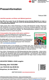 genießen. Unter allen Blutspender*innen verlost der DRK-Blutspendedienst vom 23. Februar bis 31. März 2026 drei exklusive Städtereisen für je zwei Personen nach Mailand.