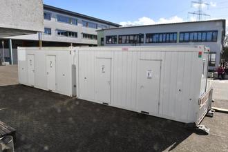 Gravierender als zunächst angenommen erweist sich der durch einen brennenden Mülleimer in der Toilette am 13. Februar verursache Schaden. Weil aufgrund der Brandursachenermittlung die Toiletten gesperrt sind und eine Sanierung ansteht wurden nun zwei Toiletten-Container auf dem Schulhof aufgestellt. Die komplette Lüftungsanlage der Schule muß nach den Worten von Kreisschuldezernent Christopher Lipp komplett gereinigt werden. Erschwert werden die anstehenden Arbeiten auch durch den Umstand, dass sich Ruß neben der Lüftungsanlage festgesetzt hat. Mit den Sanierungs- und Reinigungsarbeiten kann zudem erst nach Abschluß der Brandursachenermittlung begonnen werden. Bis alles abgeschlossen ist gibt es so eine Toiletten-Containerlösung. ©Foto: Thomas Wißner