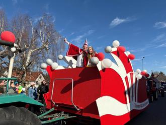 Wer am Vormittag den Springerzug in Herbstein besucht hatte, hatte danach genug Zeit, um nach Hörgenau weiterzuziehen. Pünktlich um 14.11 Uhr setzte sich dort das Spektakel in Bewegung - mit dem Prinzenpaarwagen von Leoni I. und Lukas I. an der Spitze. Gleich dahinter tuckerte Bürgermeister Lukas Becker auf einem rustikalen „Porsche Diesel“, der ein Modell des Rathauses hinter sich herzog und winkte strahlend in die Menge. Damit niemand auf dem Trockenen feiern musste, verteilte der Hörgenauer Bierbär reichlich Schoppen aus dem mitfahrenden Bierwagen des Rosenmontagsclubs.