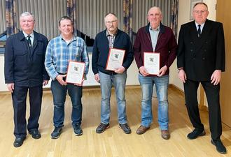 Vereinsvorsitzender Klaus Köhler ehrte Arnold Rockel für 25jährige sowie Kurt Schneider und Karl-Heinz Greb für 50jährige Mitgliedschaft in der Freiwilligen Feuerwehr Hopfmannsfeld, es gratulierte ebenfalls der stellvertretende Vorsitzende Stefan Jöckel (von links nach rechts). Foto: Winterholler