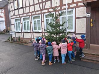 Pünktlich vor Weihnachten, haben die Kinder der Wackelzahngruppe für den Lautertaler Rathausbaum Schmuck gebastelt. Vor dem Lautertaler Rathaus ist die Weihnachtszeit nun offiziell eingeläutet. Die Kinder folgten gemeinsam mit den Erzieherinnen Ursula Dotzert, Jessica Krebs und Christina Raab der Einladung von Bürgermeister Lukas Becker und brachten liebevoll gebastelten Weihnachtsschmuck mit. Mit sichtbarer Freude hängten die Kinder Sterne sowie Weihnachtskugeln an den Baum und verwandelten ihn Stück für Stück in einen besonderen Rathaus-Weihnachtsbaum. „Ich freue mich sehr über den Besuch der Wackelzähne. Der Baum ist geschmückt, jetzt kann Weihnachten kommen“, sagt der Bürgermeister.