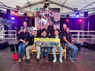 Während der kleinen Feierstunde wurden viele Bilder aus den vergangenen 50 Jahren auf einer großen Videowand gezeigt und öfters war die Familie von Peter Hartmann zu sehen. Verständlich dass Peter Hartmann an seine Freunde aus Weiershagen Erinnerungs-T-Shirts überreichte und auch das Publikum erfuhr, warum die heimische Garage nicht aufgeräumt wurde und wird; nämlich weil dort mit den Weiershagener noch gefeiert werden soll. Nicht nur das, sondern die Gruppe wird auch bei der Pfingstkirmes zum Kaffeetrinken bei Hartmanns eingeladen.