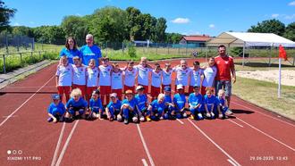 Nach dem Einlaufen stellten sich beide Teams für ein Erinnerungsfoto! In weiß stehend die F-Junioren mit Trainer Engin Weiß (rechts), knieend die Bambinis mit den beiden Coaches Hannah und Jan-Dirk Dahmer (hinten links)!