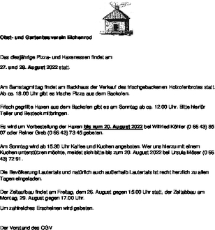 Es wird um Vorbestellung der Haxen bis zum 20. August 2022 bei Wilfried Köhler (0 66 43) 85 07 oder Reiner Greb (0 66 43) 73 45 gebeten.