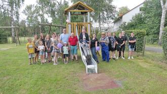 Die Dirlämmer sind stolz auf die neuen Spielgeräte auf dem Spielplatz in Dirlammen und hatten ihre Freude daran, als Bürgermeister Lukas Becker offiziell den Turm mit der Rutsche ausprobierte.