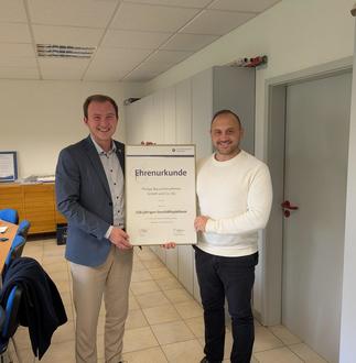 Bürgermeister Lukas Becker und Vitali Keiser mit der Jubiläumsurkunde