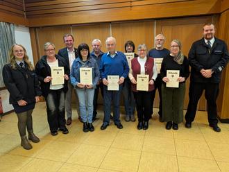 Ehrungen bei der Freiwilligen Feuerwehr Eichelhain mit folgenden Personen (von links) der Vorsitzenden Lisa Ruppel, Cornelia Ruppel, Bürgermeister Lukas Becker, Claudia Volp, Karl Krömmelbein, Helmut Schaaf, Carmen Schößler, Irmtraud Hanisch, Helmut Hanisch, Diana Möller und Wehrführer Marcel Isaakson.