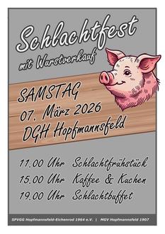 Am Samstag, den 07.03.2026, laden wir herzlich zum traditionellen Schlachtfest im DGH Hopfmannsfeld ein.