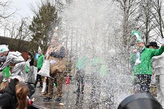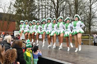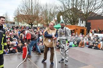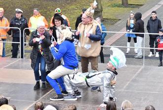 Nach 66 Minuten war alles vorbei, hatte Bürgermeister Fabian Wedemann samt seiner Magistrats-Trümmertruppe kapituliert und den Narren Stadtschlüssel samt gehäckselter Stadtkassen-Scheine aus DM-Zeiten augehändigt. Drei Spiele, vier Tanz- und eine Gesangseinlage benötigten die Narren dces Karnevalverein Harmonien Großen-Linden um mit Unterstützung von gut 333 Narren vor dem Rathaus, dass endlich Einsicht einkehrte. Nach den Eröffnungsklängen von 5x5