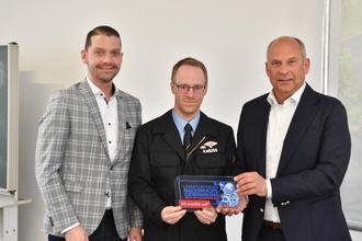 Qualitätssiegel „Landesoffensive Nachwuchsgewinnung Brand- und Katastrophenschutz – Wir machen mit!" an Stadtbrandinspektor Dr. Alexander Weiß (Mitte) und Bürgermeister Fabian Wedemann (links)