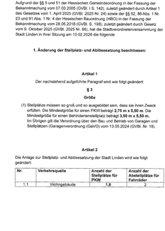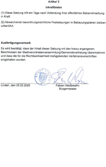 Aufgrund der §§ 5 und 51 der Hessischen Gemeindeordnung in der Fassung der Bekanntmachung vom 07.03.2005 (GVBI. I S. 142), zuletzt geändert durch Artikel 1 des Gesetzes vom 1. April 2025 (GVBI. 2025 Nr. 24) sowie der §§ 52, 86 Abs. 1 Nr. 23 und 91 Abs. 1 Nr. 4 der Hessischen Bauordnung (HBO) in der Fassung der Bekanntmachung vom 28.05.2018 (GVBI. S. 198), zuletzt geändert durch Gesetz vom 9. Oktober 2025 (GVBI. 2025 Nr. 66), hat die Stadtverordnetenversammlung der Stadt Linden in ihrer Sitzung am 10.02.2026 die folgende