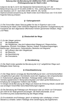 | Im Übrigen ist die Benutzung der Wege zum Zweck der Erholung erlaubt, soweit sich aus sonstigen Vorschriften keine Beschränkungen ergeben. |