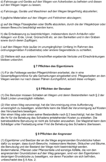 | Wer einen Weg oder einen seiner Bestandteile nach § 2 beschädigt, hat der Stadt die ihr für die Behebung des Schadens entstehenden Kosten zu erstatten. Die betriebsübliche Benutzung ist nicht als Schaden anzusehen. Der Magistrat kann dem Schädiger unter Festsetzung einer Frist die Behebung des Schadens überlassen. |