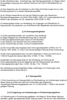 | (2) | Bei öffentlichen Bau-, Unterhaltungs- oder Reinigungsarbeiten an Wegen haben die jeweiligen Angrenzer den üblichen Überwurf von Erde im Bankettbereich zu dulden. |