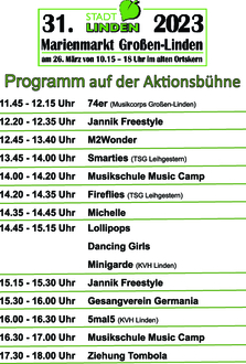 Anschließend finden auf der Aktionsbühne in der Obergasse Aufführungen von verschiedenen Lindener Vereinen und weitere Attraktionen statt. Als Highlight ist hier sicher für viele jüngere Besucher, der zweimalige Auftritt von Jannik Freestyle zu erwähnen (Fußball Freeclass="tabblue" und Social Media Star). Im Anschluss an seine Auftritte steht er auch für ein „Meet und Greet“ sowie für Autogramme zur Verfügung.