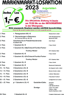 Zum Preis von nur 1,- € sind während des gesamten Markttages in der Zeit von 10 Uhr bis 17.15 Uhr im Marktbereich, am Infostand und in der TV-Halle Lose erhältlich. Um 17.30 Uhr findet die Verlosung auf der Aktionsbühne in der Obergasse statt - der gesamte Erlös wird je zur Hälfte an „Selbstbestimmt Leben Linden e.V.“ und den „Förderverein Soziale Dienste Linden e.V.“ übergeben.