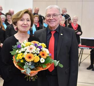 Adriana Pop (lkinks) gratulierte Germania-Schriftführer Hans-Ulrich Heymann zur über 30jährigen Chorleitertätigkeit bei Germania Großen-Linden. ©Fotos: Thomas Wißner