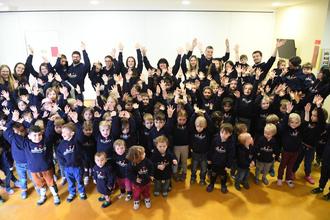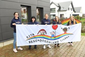 50 Jahre Kindergarten Regenbogenland werfen ihre Schatten voraus. Oder besser gesagt sollen noch am 16. Juni mit einem Jubiläums-Sommerfest gefeiert werden. Vor diesem Hintergrund hat der Förderverein der Kindertagesstätte Regenbogenland nun bereits Kinder und Erzieher gleichermaßen mit einem tollen Geschenk überrascht. Insgesamt 140 sogenannte Hoodies (Kapuzenpullis) mit dem Logo der Kindertagesstätte auf der Vorderseite überreichten nun bei einer Zusammenkunft die Vorstandsmitglieder Liesa Dort, Meike Keil, Theresa Schmidt und Christine Ginter Kindern und Erziehern. Darüber hinaus hat der Förderverein auch eine Fahne mit dem Logo der Kita bedrucken lassen, welche der Leiterin Heike Strobl überreicht wurde. Diese wurden am Fahnenmast bim Eingangsbereich zum Regenbogenland gehisst.