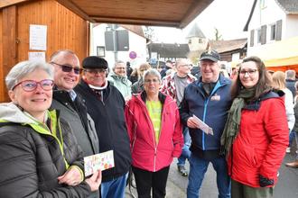 Josef Auer (2. von rechts) aus Purgstall konnte kürzlich seinen 70. Geburtstag feiern. Bei seinem Besuch am vergangenen Wochenende zum Marienmarkt wurde der ehemalige Purgstaller Feuerwehrkommandant von Wolfgang Hofmann (2. von links), Ulrich „Burschi“ (3. von links) und Cornelia (3. von rechts) Weihrauch überrascht. Nachträglich zum runden Geburtstag überreichten diese dem „Sepp“, wie der bereits vor 20 Jahren mit der Ehrennadel der Stadt Linden ausgezeichnete Jubilar liebevoll genannt wird am Stand der Purgstaller Eintrittskarten für das „Festival der Musik“ des Musikcorps im November in der Buderus-Arena in Wetzlar. ©Foto: Thomas Wißner
