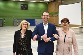 Um 20.18 Uhr verließ nach ersten Interviews als einer der letzten der künftige Bürgermeister Fabian Wedemann mit Ehefrau Anna-Sophia und Mutter Rita die Stadthalle ©Fotos: Thomas Wißner