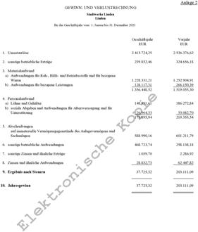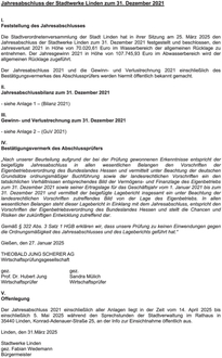 Der Jahresabschluss 2021 einschließlich aller Anlagen liegt in der Zeit vom 14. April 2025 bis einschließlich 5. Mai 2025 während den Sprechstunden der Stadtverwaltung im Rathaus in 35440 Linden, Konrad-Adenauer-Straße 25, an der Info zur Einsichtnahme öffentlich aus.
