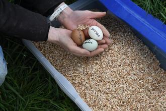 Auch wenn der eigentliche Rassehühner-Aktionstag des mit dem Umweltpreis der Stadt Linden ausgezeichneten Familienbetrieb „Streuobstziege“ völlig verregnet war, so fanden sich dennoch einige interessierte Beuscher ein. Noch bis Mitte Mai können sich interessierte Eltern mit ihren Kindern über die in unmittelbarrer Nähe zum Grillplatz in Leihgestern gehaltenen Hühner informieren. Dafür kann das Türchen gerne geöffnet werden, Eier gefühlt und und sich auch über das Futter der Tiere informiert werden. Bei Bresse gauloise, New Hampshire und Marans handelt es sich um alte Hühnerrassen. Und auch wenn sich diese drei Rassen schon auf den ersten Blick unterscheiden, bleibt doch eine Gemeinsamkeit. Es sind alles Zweinutzungsrassen, bei denen die Hennen eine gute Legeleistung und die Hähne im Alter von vier Monaten einen solventen Sonntagsbraten hergeben. Tiere die aufgrund ihres Geschlechts „unwirtschaftlich“ sind gibt es hierbei nicht. Die Aktion von Familie Lenhart wird durch das hessische Förderprogramm „100 nachhaltige Bauernhöfe“ unterstützt. Prof. Dr. Katharina Lenhart führt gemeinsam mit ihrem Mann den landwirtschaftlichen Betrieb „Streuobstziege“ im Nebenerwerb. „Mit diesem Projekt möchten wir zeigen, dass Umweltschutz, artgerechte Tierhaltung und die Produktion von hochwertigen Lebensmitteln kein Widerspruch sind. Auch wenn es nicht darum geht die Frage zu klären ob nun das Ei oder die Henne zuerst da waren, so geht es doch darum Unterschiede zu zeigen, wie etwa beim Aussehen der Eier. Die Eifarbe wird durch die Erbanlagen (Gene) des Huhns festgelegt und nicht durch die Fütterung. Sie ist als Rasse bedingt. „Allerdings kann man es Hühner an den Ohrscheiben ansehen, ob sie weiße oder braune Eier legen. Bei Weißlegern sind die Ohrscheiben weiß, bei Braunlegern rot. Die Ohrscheibe der Hühner befindet sich hinter den Augen“, verrät Katharina Lenhart. Dies ist auch auf Infoblättern festgehalten, die interessierte Besucher vor Ort finden. Eine Besonderheit finden Besucher bei den Marans, auch Schokoleger genannt. Diese Rasse legt extrem dunkle Eier, die häufig auch noch mit kleinen Punkten versehen sind. De Größe eines Hühnereis wird bedingt durch Rasse und Alter des Huhns. Im ersten Legejahr sind die Eier noch etwas kleiner (46 bis 55 Gramm), im zweiten und dritten Legejahr können sie gut und gerne 70 Gramm und mehr erreichen. Die Anzahl der im Jahr gelegten Eier nimmt dann aber deutlich ab, so dass die meisten Rassehühner nach dem dritten Legejahr geschlachtete werden. Die Farbe des Dotters ist einzig und alleine von den über das Futter aufgenommenen Farbstoffen abhängig. Und über die Bestandteile des verwendeten Futters informiert der Familienbetrieb ebenfalks vor Ort. „Die einzelnen Bestandteile unseres Hühnerfutter beziehen wir von einem Landwirt aus Leihgestern. Das Getreide (Hafer, Gerste, Weizen) kommt direkt vom Acker zu uns.“ In den PE Flaschen in einer Kiste im Hühnergehege kann das fertig gemischte Futter, welches die Tiere auch in ihrem Futterspender haben, in Augenschein genommen und die Zusammensetzung nachgelesen werden. Neben dem Futter benötigen die Hühner auch frisches Wasser. Dieses bekommen sie aus Tränkeeimern, in denen das Wasser nicht verschmutzt wird. ©Foto: Thomas Wißner