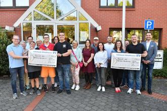 Am Montag wurden im Rathaus während einer Feierstunde die Preise des m21. Marienmarktgewinnspiel sowie dessen Erlös übergeben. 3.478 Lose zum Preis von einem Euro und damit gleich 524 mehr als im Jahr zuvor wurden verkauft. Gar mancher Marienmarktbesucher nutzt das Gewinnspiel auch zu einer Spende so dass nun 3.531 Euro an die beiden begünstigten Einrichtungen, das „Bunte Eck“ des Verein Selbstbestimmt Leben in Großen-Linden und die Außenstelle Linden der Tafel Gießen übergeben und die Gesamt-Spendensumme auf 64.500 Euro gesteigert werden konnte. Insgesmat 28 Preise im Gesamtwert von rund 2.000 Euro, die allesamt von Unternehmen und Restaurantbetrieben aus der Stadt gespendet wurden, so dass der Verkaufserlöse der Lose samt Spenden im vollen Umfang den beiden Vereinen zugutekommt. Die Lose waren zum Abschluß des Markttages gezogen worden und die Gewinner nun auch zur Preisübergabe ins Rathaus eingeladen. Marktmeister Tim Ole Steinberg noch jenen Gewinnern ihre Preise übergeben, die nicht bei der Gewinnziehung anwesend waren. Den Hauptgewinn in Form eines Reisegutscheins über 700 Euro vom Reisezentrum Linden konnte Petra Frank aus Großen-Linden aus den Händen des Spenders Reza Eghbal vom Reisecentrum Linden in Empfang nehmen. Diesem dankte Steinberg ganz besonders für die Auslobung des ersten Preises, wie auch allen anderen Unterstützern. Bürgermeister Fabian Wedemann dankte der Marienmarktkommission für ihre gelungene Arbeit und überreichte gemeinsam mit Steinberg Spendenschecks über jeweils 1.765,50 Euro an die Leiterin der Tafeln in. Stadt und Landkreis Gießen Anna Conrad, die das Geld für Lebensmittelgutscheine für die Tafel in Linden wie auch für den Austausch der Kühlschränke verwenden will, sowie an Vorsitzende Roswitta Kirchhöfer und Kassenwartin Silvia Hochmuth für den Verein Selbstbestimmt Leben in Linden. Die beiden Vorstandsmitglieder nahmen den Spendenscheck gemeinsam mit den Bewohnern Enrico Hochmuth, Joshua Kaufmann und Lukas Kirchhöfer und Empfang. ©Foto: Thomas Wißner