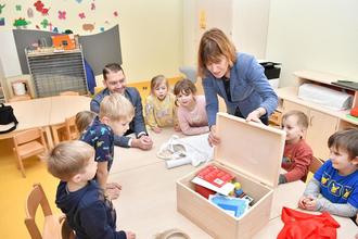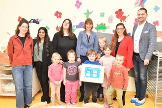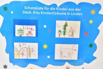 Ein Dutzend Bilder hatten Kinder der städtischen Kindertagesstätte Kinder(t)räume in Leihgestern für eine Weihnachtskartenmotivaktion des Hessische Ministerium für Arbeit, Integration, Jugend und Soziales (HMSI) gemalt. Dieses hatte alle zehn hessischen Kulturkitas dazu aufgerufen sich an der Aktion zu beteiligen. Vier Motive der Kinder(t)räume-Kinder waren letztendlich als Motiv ausgewählt worden. Etwas mehr als 1.000 Karten hat das Ministerium nach den Worten von Sozialministerin Heike Hofmann (SPD) „im ganzen Land verschickt“. Um sich bei den Kindern zu bedanken waren unter den teilnehmenden Kitas fünf ausgelost worden, die für ihre Bemühungen mit einer Schatzkiste belohnt wurden. Hofmann brachte diese gemeinsam mit Landtagsabgeordneten Nina Heidt-Sommer (SPD) in der Kita vorbei, die ihnen Einrichtungsleiterin Mahkameh Farahpour-Haghani und ihre Stellvertreterin Marigona Bese zusammen mit Bürgermeister Fabian Wedmeann (CDU) bei einem Rundgang vorstellten. Gemeinsam mit den Kindern machte sich dann Hofmann nach Übergabe daran diese mit Materialien für die weitere künstlerische Praxis gefüllte Schatzkiste zu öffnen. Die Kita Kinder(t)räume nimmt am landesweites Modellprojekt zur Förderung frühkindlicher kultureller Bildung und Teilhabe, Kulturkita Hessen, teil. Dieses unterstützt Kindertagesstätten dabei, kulturelle Bildung fest im Kita Alltag zu verankern, Kindern vielfältige Zugänge zu Kunst und Kultur zu eröffnen und ihre Kreativität und Persönlichkeitsentwicklung zu fördern.