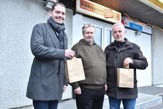 Faik Uras (rechts) überreichte Geschenkpakete an Fabian Wedemann (links) und Jürgen Sievers (Mitte)