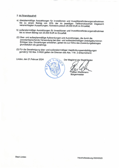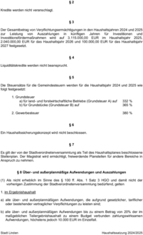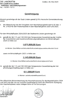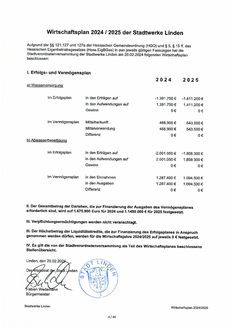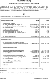 Der Haushaltsplan und der Wirtschaftsplan liegen in der Zeit vom 21.05.2024 bis 07.06.2024 in der Stadtverwaltung Linden, Konrad-Adenauer-Straße 25, Zentrale, während der üblichen Sprechzeiten öffentlich aus.