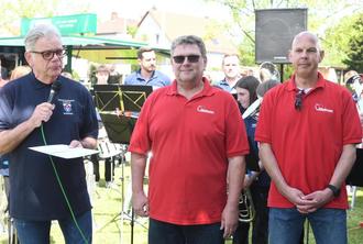 In Würdigung langjähriger Verdienste für das Feuerwehrmusikwesen wurden mit dem Ehrenzeichen für Hessische Feuerwehrmusiker in Gold durch (v.l.) Kreisstabführer Werner Rauber-Wagner Roland Reuschel und Ralph Merseburg ausgezeichnet