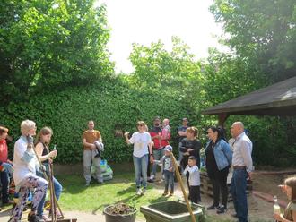 Gleichzeitig wurde dieser Tag dafür genutzt, den bereits im Februar gegründeten Förderverein der Lindener Zwerge offiziell den Familien vorzustellen. Frau Inga Schmandt, die Schriftführerin des Vereins stellte den Vorstand vor, zu dem neben ihr der 1.Vorsitzende Herr Dr. Philipp Schurig, die 2. Vorsitzende Frau Miriam Engländer-Zulauf und Herr Milan Schepers als Kassenwart gehören. Bereits am Marienmarkt 2023 hatte der Verein einen Stand, an dem neben Kaffee und Muffins auch von den Kindern gestaltete Tassen gekauft werden konnten. Wer an diesem Tag Mitglied des Fördervereins geworden war, nahm automatisch an einer Verlosung teil. Zu gewinnen gab es Einkaufsgutscheine, die der „Rewe Markt Marchel“ in Großen-Linden freundlicherweise zur Verfügung gestellt hatte. Die Gewinner*innen der Verlosung wurden ebenfalls am Garten-Tag bekannt gegeben. Nähere Infos zum Förderverein „Lindener Zwerge“ finden Sie unter https://www.foerderverein-lindener-zwerge.de/ finden.