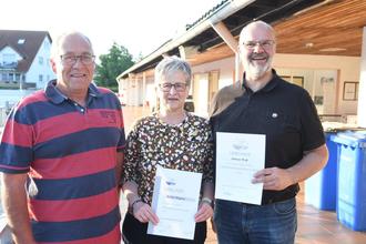 (v.l.) Vorsitzender Dirk Heil zeichnete die langjährigen Mitglieder Bärbel Müglich und Andreas Weiß mit dem Mitgliederehrenzeichen in Silber aus