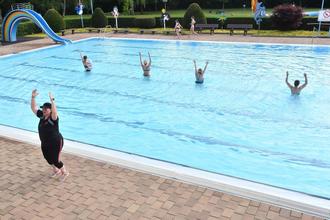 Aqua-Zumba im Freibad startete am Dienstag. Kirstin Viertelshausen konnte zur ersten Veranstaltung fast ein halbes Dutzend Teilnehmerinnen begrüßen. Künftig jeweils dienstags ist nun wieder Aqua-Zumba-Zeit, wobei in der nächsten Woche die Veranstaltung nach Pfingsten bereits aufgrund der schlechten Wetterprognosen abgesagt wurde. ©Foto: Thomas Wißner