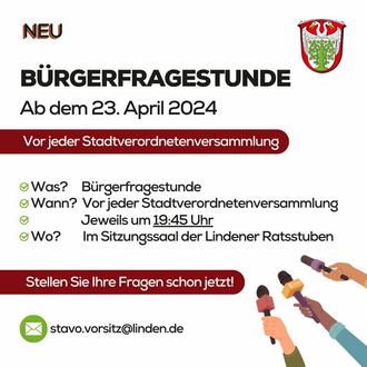 Gerne können Sie uns Ihre Fragen auch eine Woche vorher per E-Mail (stavo.vorsitz@linden.de bzw. fabian.wedemann@linden.de) oder schriftlich (Magistrat der Stadt Linden, Fachdienst 1.1 – Gremien und Öffentlichkeit, Konrad-Adenauer-Str. 25, 35440 Linden) zukommen lassen, dies sichert eine qualifizierte Antwort in der Fragestunde. Tagesordnungspunkte der jeweiligen Stadtverordnetenversammlung können nicht zum Gegenstand der Fragestunde gemacht werden.