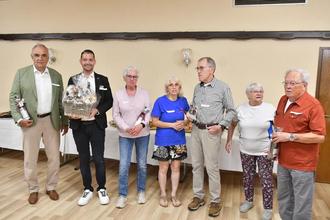 wurden dann in den Ratrsstuben Geschenke ausgetauscht (v.l.) Radsport-Abteilungsleiter Drt. Hermann Lodde, Bürgermeister Fabian Wedemann, Christel Franz, Cathy Lisky, Horst Welter, Antoinette Lauer und Horst Faber