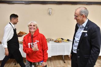 Einen Hoodie der TSG schenkte Vorsitzender Sascha Gewiese (rechts) der die Vorsitzenden des Vereins für Sport und Freizeit Macheren Cathy Lisky ti
