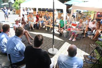 Beim Politiktalk beantworteten (v.l.) Kreis-Verkehrsdezernent Christian Zuckermann (Grüne), Verkehrsplaner Alexander Hentschel (SPD), Hartmut Schau (FW),Stadtrat Dennis Dern (Grüne), Landrätin Aniota Schneider, Gudrun Lang (beide SPD) und Thomas Altenheimer (CDU) mit Moderatorin Dr. Barbara Ibe