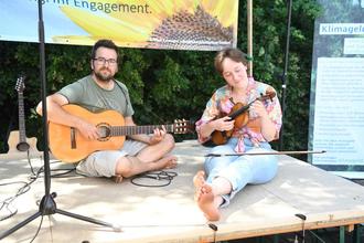Am Nachmittag forderte das Duo FogelF aus Gießen mit Constantin Pukownick (Gesang und Gitarre) und Helena (Geige) mit eigenen politischen Liedern dazu auf, in der Gesellschaft wach zu sein. ©Foto: Thomas Wißner