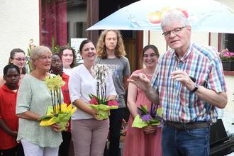 Vorsitzender Erhard Köhler (rechts) dankte stellvertretend für alle Helferinnen in den 47 Spatzen-Jahren Margit Peuker (links) udn Bianca Gerstenhöfer (Mitte) ebenso mit Blumen